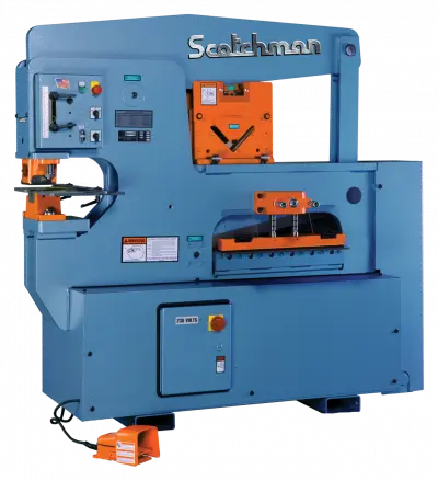 Are you looking for an ironworker machine that can punch and shear 1” thick, 65,000 tensile plate? Scotchman’s 12012-24M is the machine for the job. The Scotchman 12012-24M hydraulic ironworker can punch a 1-1/2” hole through 1” plate, its 24” wide flat bar shear can shear 1” x 12” and 1/2” x 24” base plate and this machine is supplied with a 6” x 6” x 1/2” angle shear. The tool table design is a bonus feature that allows the operator to quickly and easily mount optional tooling making this ironworker adaptable to your specific job. The Scotchman 12012-24M is American-made and backed by our best-in-the-business 3-year parts warranty.