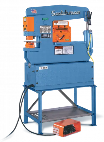 The Scotchman Porta Fab 45 hydraulic ironworker is the perfect choice for the small fabricator! This portable ironworker is designed for in-plant or on-the-job operation and uses 110-volt power for added convenience. Featuring a 45-ton punching capacity, the Porta-Fab 45 can punch 1-1/8″ through 1/2″ material and comes standard with a 3-in-1 combination tool consisting of a 3/8″ x 6″ flat bar shear, 3/4″ rod shear, and a 3″ x 3″ x 5/16″ angle shear. The Porta Fab 45 hydraulic ironworker also accepts many other optional Scotchman tooling components including press brakes, pipe notchers, rectangular notchers, and picket tool attachments. The American-made Porta Fab 45 utilizes a hydraulic system with electric valve and remote foot pedal for ease of use, an adjustable electric stroke control with scale, and is backed by Scotchman’s industry leading 3-Year Warranty.